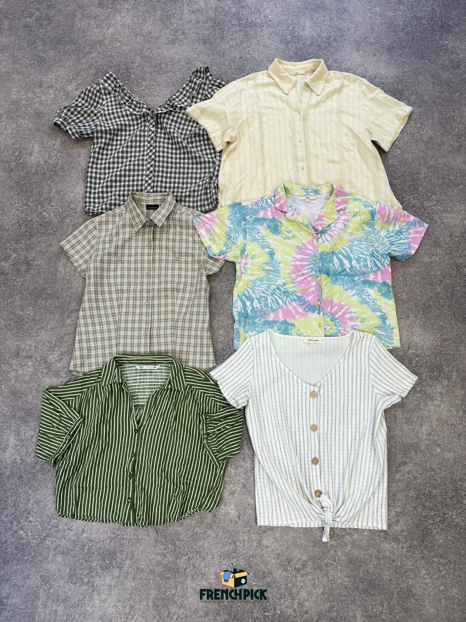 Cette box contient une sélection exclusive de chemisiers à manches courtes, de seconde main. Vous y trouverez des modèles aux coupes variées, parfaits pour la mi-saison et l’été. Ces pièces se distinguent par leurs matières légères, leurs couleurs multiples, leurs boutons et cols travaillés. La box inclut des chemisiers issus de la grande distribution ainsi que de marques telles que Zara, Monoprix, Caroll, Camaïeu, H&M, Pimkie et bien d’autres.